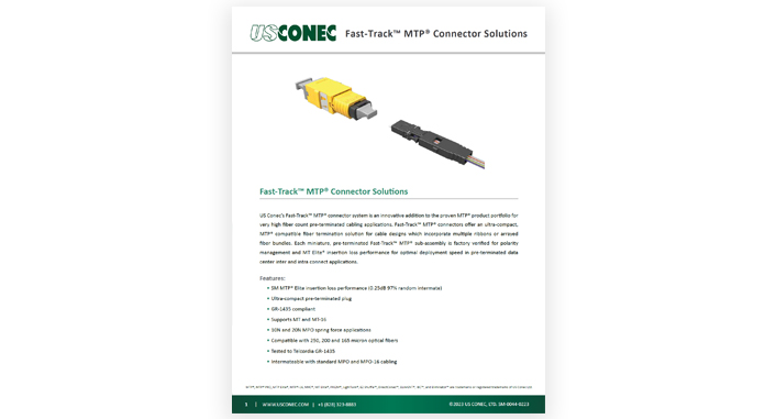 US Conec的 Fast-Track™ MTP®连接器系统是经过验证的MTP® 产品系列的创新补充,适用于多芯光纤、预制布线的应用。